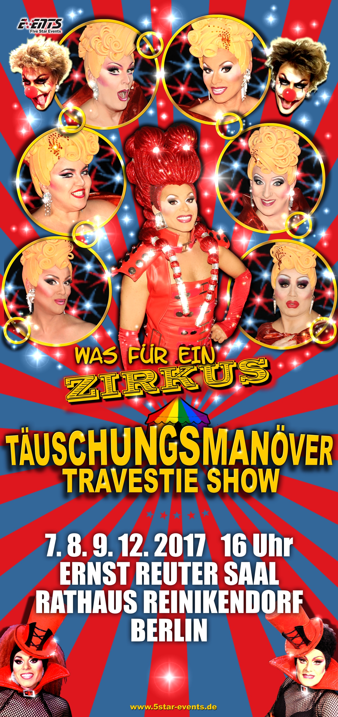 Mit Stil und Niveau präsentiert das Hamburger Ensemble Täuschungsmanöver die neue Produktion „Was für ein ZIRKUS!“. Im Mittelpunkt steht die bunte und schillernde Welt der Travestie, in der sich Akrobatik, Comedy und Entertainment zu einer einzigartigen Show vereinen. Erleben Sie ein völlig neues Showkonzept mit aufwendig gefertigten Kostümen und Bühnenbildern. Täuschungsmanöver nimmt Sie mit auf die große Showbühne. Treffen Sie auf attraktive Showgirls, Clowns und Paradiesvögel, die ihre spitzen Schnäbel und Zungen zum Einsatz bringen.